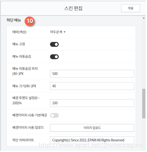 - 주요 관리 기능 : 메뉴 태마, 메뉴 위치(왼쪽/오른쪽 선택), 메뉴 크기, 메뉴 배경 이미지 사용