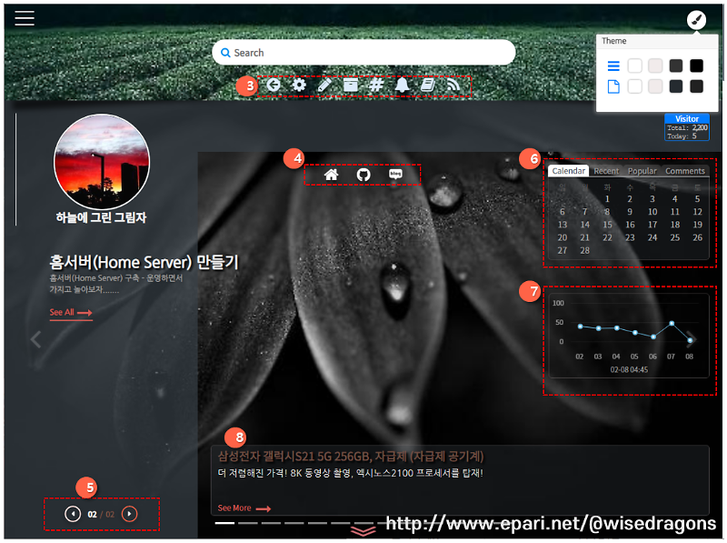 - 주요 관리 기능 : 방문자수, 방문자 그래프, 달력, 최근글, 인기글, 최근 댓글